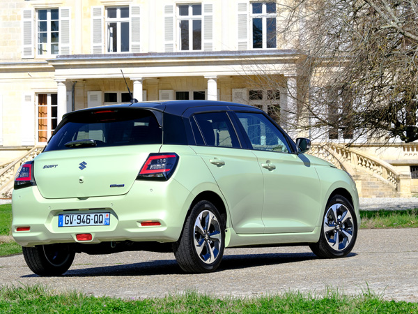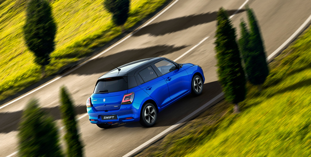 Muskuļotās kontūras, kas iezīmē jaunā Swift profilu, un peldošais jumta dizains piešķir enerģiska viegluma sajūtu. Standarta jumta spoilers nodrošina samazinātu gaisa pretestību.